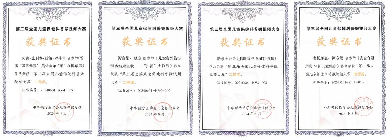 本次大赛旨在推动儿童保健知识的普及和传播,满足社会及家庭对于儿童健康知识的共性需求,湘雅三医院儿科团队积极响应号召,结合科室特色、专业知识及独特的科普理念,精心策划和制作了多部儿童保健科普微视频。其中,湘雅三医院儿科姜梅的作品《肥胖防控 从娃娃抓起》在营养喂养板块荣获二等奖,何微、张利卷、雷俊、罗伟伟的作品《警惕“屏幕暴露” 莫让童年“锁”在屏幕里》在养育照护板块荣获二等奖,谭彦娟、夏琼的作品《儿童意外伤害预防健康宣教——“扫雷”大作战》在疾病与预防伤害板块荣获二等奖,唐杨思思、谭彦娟的作品《安全合理用药 守护儿童健康》在康复及其他板块荣获优胜奖。