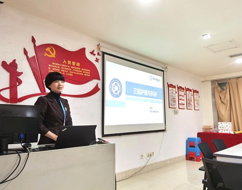 会议最后,医院护理部副主任、科研小组组长谢建飞就成员的发言逐个发表看法。她说,对待生命,我们应当无悔于每一次;对待科研,我们应当勿忘初心、克服困难才会进步。她通过PPT为大家介绍了三院护理与科研现状、科研小组成员分组情况及年度工作活动安排。每个小组均安排一位经验丰富的导师进行指导,定期开展科研讨论活动,以求科学、规范、有序、高实践性的团队建设,推动医院护理科研发展;并对医院高学历护士提出了“做一个好的临床实践者、管理的协助者、科研的创新者”的由衷期望,希望通过护理科研小组,切实推动临床护理科研及护理学科蓬勃发展,一同为护理事业的建设添砖加瓦。
