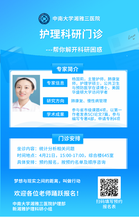 4月21日下午,中南大学湘雅三医院“护理科研门诊”在综合楼首次“开诊”。该门诊为中南大学湘雅三医院护理部联合“新湘雅”护理科研小组,继护理科研兴趣班(提高班与基础班)结业后特别开设,此门诊旨在为个性化解决护理科研疑虑,进一步提质护理科研成果,助力护理“双一流”建设。