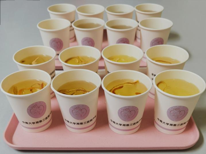 虽然无痛分娩、自由体位管理、术后镇痛泵等技术的应用已大大降低分娩的风险和身体的疼痛,但对于所有产妇而言,为人母后身心的虚弱和疲惫依旧是一个巨大的挑战。护士们微笑着给刚刚完成分娩的妈妈们送上一杯甜蜜的红糖水(除妊娠期糖尿病的妈妈),给剖宫产妈妈们送上术后第一杯泡着陈皮的温水。每一杯红糖水和陈皮水,包含的都是产科的爱与责任。科室用这一杯红糖水和陈皮水,给妈妈们补充能量,滋润口唇,减少腹胀,让她们在人生最重要的时刻感受到她们是被关注着的,更是被爱着的,为新生命守护注入勇气和力量。