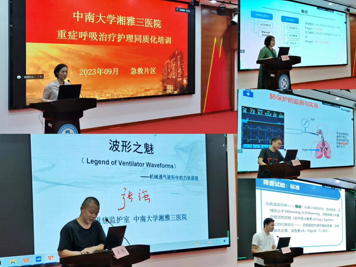 为提升医院急危重症护理团队的重症呼吸治疗专业能力,加强呼吸治疗同质化管理,中南大学湘雅三医院急救片区于9月8~9日、9月15~16日组织了两批重症呼吸治疗护理同质化培训,重症医学科、内科ICU、神内ICU、神外ICU、CCU、EICU、急诊抢救室护士参与培训。