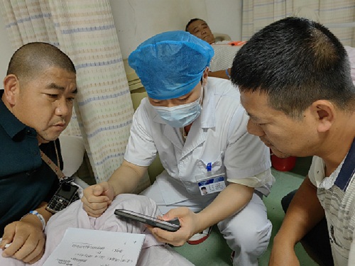 李振邦、李思雨、马曌三位“小老师”去病房给患者做一对一的个性化教育。对于行走不便的42床谭叔叔,以蹲着姿势与病友交流和互动,根据每个患者的不同需求,分别对患者进行《糖尿病口服药的用法》、《糖尿病的运动及注意事项》、《认识糖尿病及并发症》三个方面进行宣教指导。病友及家属对有针对性的个性化宣教表示热烈欢迎,他们认真听取知识点,家属在旁边仔细地做笔记。对于患者的疑问,护生在老师的指导下耐心地解答,获得了病友们的一致好评和鼓励。42床谭叔叔说:“希望以后医护人员和实习同学能有更多的机会和时间亲临床旁指导患者,让他们在日常生活中少走弯路,延缓糖尿病并发症的发生。”