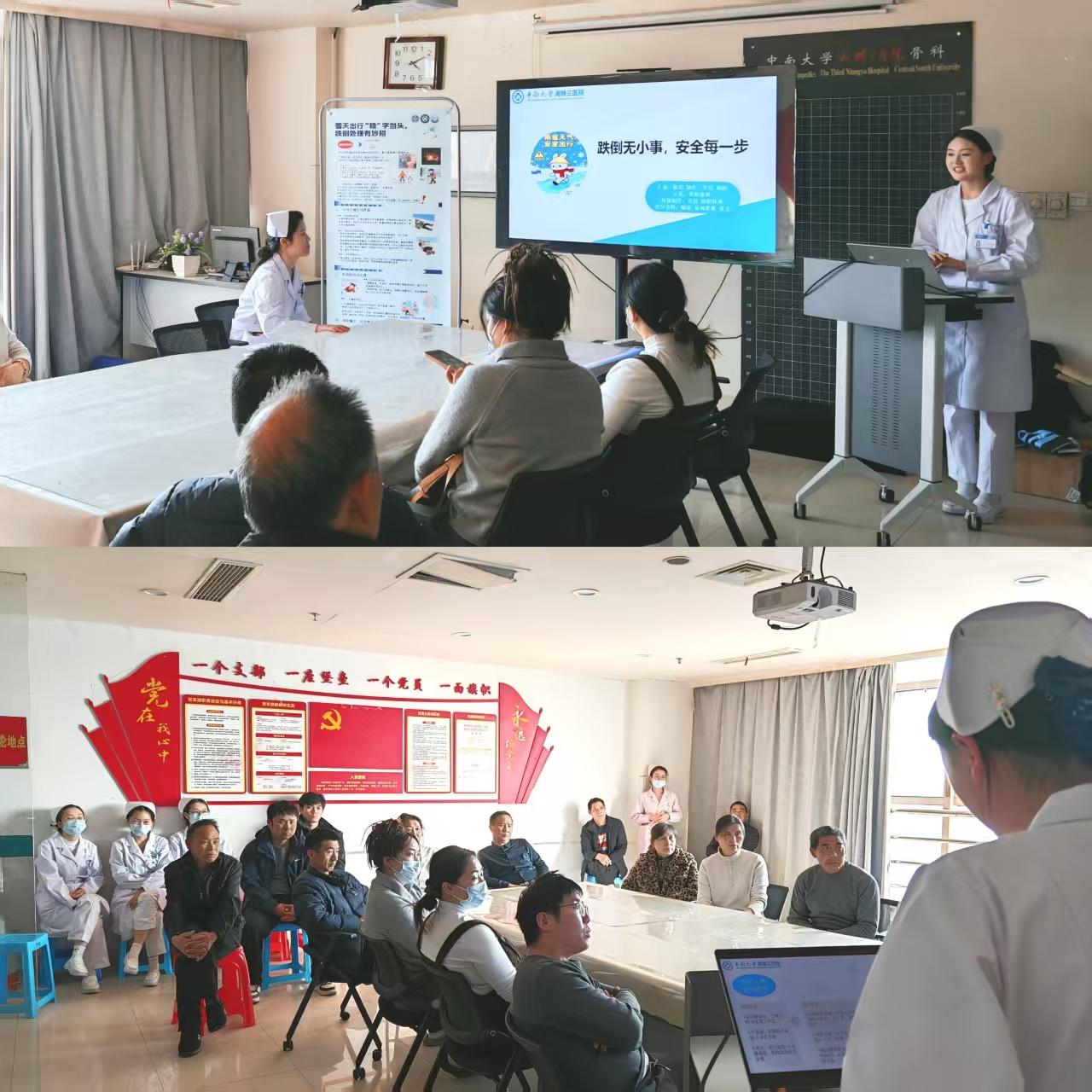 为应对长沙近期雨雪降温天气,保障患者及家属出行安全,中南大学湘雅三医院骨科和放射介入科综合病区于1月14日组织举办了一场以“雨雪天气防滑防跌倒”为主题的患教会。本次活动在护士长喻俊的指导下由总带教易杨梦妮带领娄底职业技术学院护理实习生共同策划开展,通过形式多样的宣教方式,切实提升患者及家属的自我防护能力,获得一致好评。