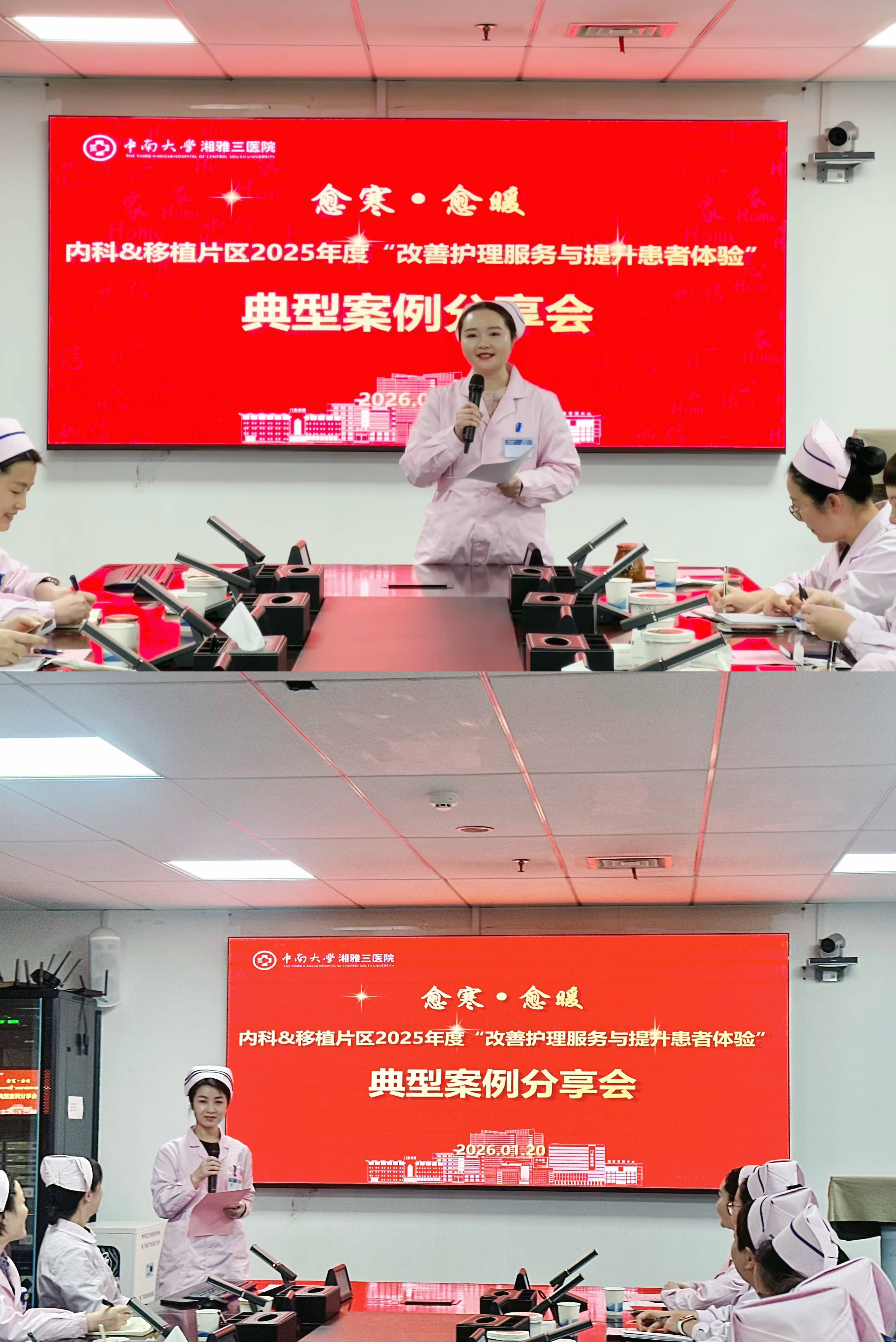 1月20日,恰逢大寒节气与长沙今冬初雪,中南大学湘雅三医院内科&移植片区在外科楼19楼会议室开展“改善护理服务与提升患者就医体验”典型案例分享会。这场以“愈寒·愈暖”为主题的盛会,由呼吸与危重症医学科护士长杨阳主持,护理部副主任谢建飞、片区科护士长吴小霞及各科室护士长、护理骨干代表齐聚一堂,以临床实践为基、以经验分享为桥,共探护理服务提质增效新路径。