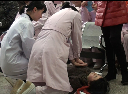 患者和家属很是着急,一边候诊一边聊天护士很耐心地做着解释和安抚工作。不久,护士在巡视候诊病人时,发现8号女士呻吟着:”哎呦、哎呦!双手放在胸前,家属吓得大声直叫:“怎么了?怎么了?”护士立即走到病人面前查看病情,很快确定病人呼吸、心跳全无。立马进行就地抢救,置患者平躺于地上,迅速疏散人群、对讲机呼救、徒手心肺复苏、刘护士迅速推出抢救车,开放静脉通道、给氧。听到抢救信号后,一楼大厅的陈护士立即控制电梯,外科的曾护士立即送来平车、被子,一场激烈的抢救正在紧张有序的进行