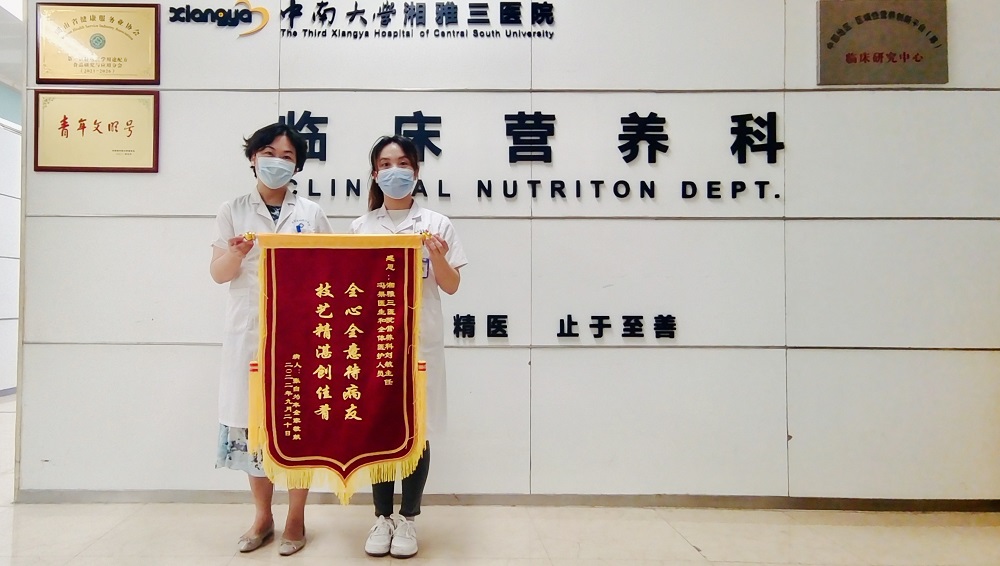 我们全家非常感谢中南大学湘雅三医院营养科刘敏主任和冯果医生的指导,他们润物细无声的营养治疗让老张活的有质量、有保障,并且老张好几次进ICU都能否极泰来,与他们精细的营养治疗有密不可分的关系,所以特制此锦旗,聊表谢意。