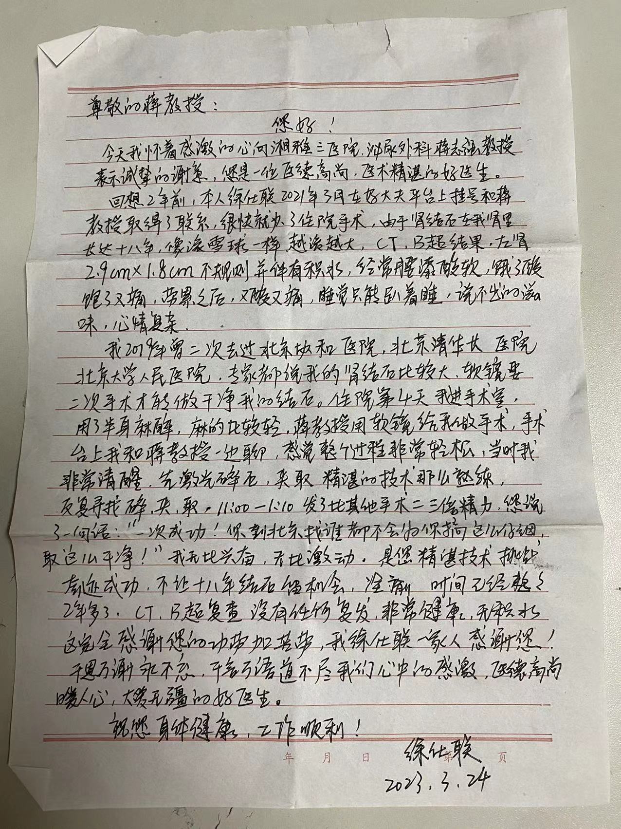 我是您的患者徐仕联,2021年入住泌尿外科,您为我进行了手术治疗,术后我的康复非常好。“结石不是病,疼起来却要命!”这句话是我与结石抗争的真实体验。所以每当我脑海中再现曾经被结石折磨的痛不欲生,经常腰膝酸软,睡觉只能趴着睡的痛苦回忆;以及辗转就诊多家医院医生均告诉我手术复杂,需要多次手术的危险告知。您的医术给我带来的不仅是健康的身心,更是生活的新生!这一路与结石抗争,我的内心非常痛苦。而现在的“无痛”生活来之不易,更是愈发珍惜和感激!