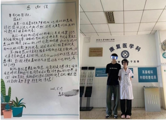 据介绍,今年6月10日高考一结束,刘同学便在母亲的陪伴下来到中南大学湘雅三医院康复医学科就诊。刚开始,刘同学一说话便面红耳赤,几乎每一句话的第一字均出现明显重复,例:“我……我……我今年18岁”。有时在句中还会出现明显的发音延长,急于表达时更会出现异常呼吸导致发音中断并伴随着身体僵硬。刘同学表示这种症状自7岁开始就出现,在初中时越来越严重,一直不知道如何解决。由于讲话结巴这个问题,他一直避免在人群中说话,说话时更是不敢直视别人。鉴于上述症状,康复医学科李旭红主任诊断其为口吃,并立即让彭静主管言语治疗师进行了言语治疗。经过暑假的五次治疗,目前患者的口吃症状已经得到明显改善。刘同学表示“非常感谢彭医生的专业指导,对彭医生精益求精的医术、认真负责的态度和仁心仁术的医德表示敬佩。我现在终于可以从容、体面地把话讲出来了”。