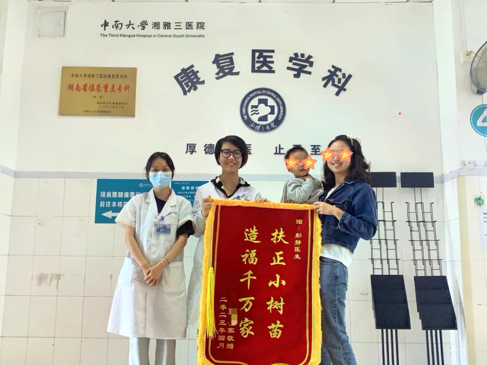 近日,小明和小强的家长带着锦旗来到中南大学湘雅三医院康复医学科言语治疗室,感谢主管言语治疗师彭静用专业精湛的言语治疗,成功让自己的孩子开口说话。