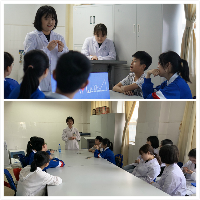 本次研学活动由三个部分组成,分别为基础知识介绍、针灸推拿实地考察和参观中药房。2016级五年制临床医学第二组学生代表首先向长雅中学的5名初中生介绍了有关中医学的科普知识。张婷老师跟同学们分享了进入春夏季节后,如何从精神、起居、饮食、运动等方面进行身心调养,以及当季常用的食补方案及食补禁忌等中医养生知识。
