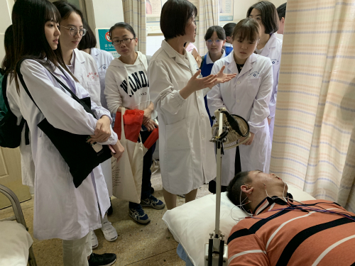 紧接着大家来到中医科针灸推拿室现场观摩。张婷老师向同学们介绍了足三里、合谷等养生保健穴位的简便定位方法,并通过一些临床实例向同学们讲解了针灸治疗的优势病种。同学们饶有兴趣地相互定位,相互纠正,意犹未尽。