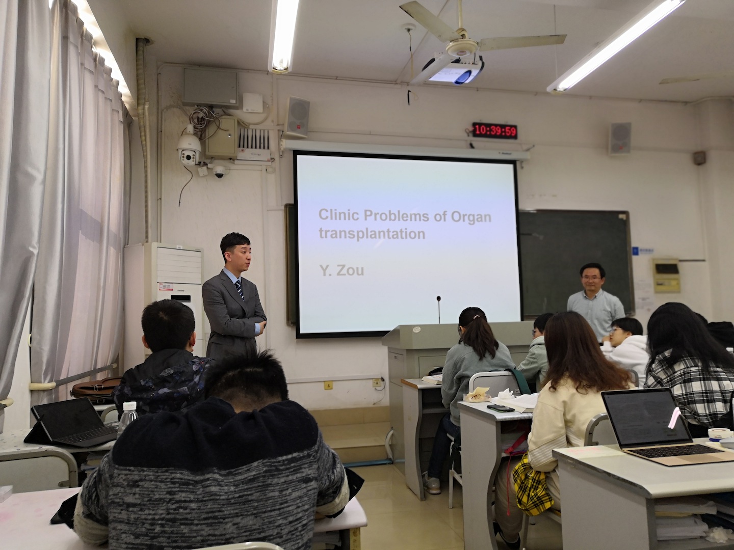 免疫学是医学生的必修课程,也是目前医学科研前沿和热点科目,是所有临床科室都可以应用的一门学科,但能将免疫学融会贯通地应用于临床工作和研究却不是一件容易的事情。为激发同学们对免疫学的兴趣,同时提前接触临床知识,进一步体会免疫学在临床中的应用,免疫系主任邹义洲教授邀请了中南大学湘雅三医院移植科青年医师庄权一同讲授《移植免疫》。