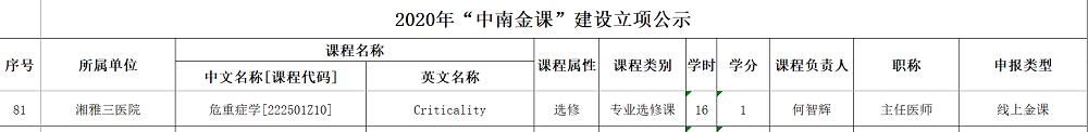 为助力教育部“双万计划”的实施,进一步深化本科教育教学改革,提升课程教学质量,按照中南大学本科教育行动计划的整体部署,学校持续推进课程专项立项建设工作。“中南金课”的评比是按照学校“1326工程”的统一部署,为全面提升本科教学质量,培育一批国家级和省级一流课程而打造的一系列高品质课程而设立的项目,分为线上、线下、线上线下混合式三类“金课”。通知下达后,何智辉立即会同教学骨干力量共同商讨,经综合考虑后,决定申报危重症学的线上项目。时间紧、任务重,何智辉在统筹安排并完成各项临床工作任务的同时,连夜修改项目申请书,并亲自参与申报课程的视频录制。项目经二级单位推荐、相关负责部门形式审查、专家网评、会评等层层测评,最终成功立项。该金课的成功立项标志着我院重症医学跻身医学本科生教育专业教学前沿阵地,为学科发展进一步夯实基础,并将更好地为重症医学储备后备力量。