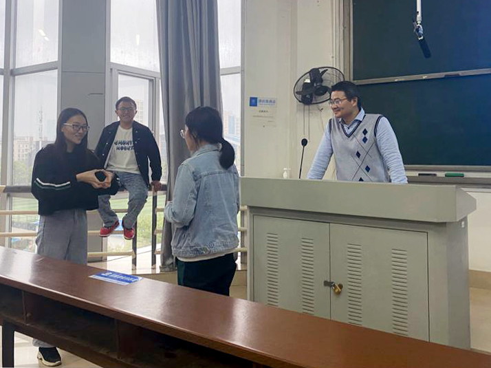 赛后,便进入了氛围轻松的娱乐环节——“你画我猜”游戏。同学们分成三组,由李国安提供题板,同学们通过肢体语言向下一位同学传递信息,并由最后一位同学说出答案。谜面有的是专业名词,有的则体现生活趣味,同学们沉浸其中,把动作和表情发挥得淋漓尽致,大家都一改平日严肃认真形象,只为向同伴们提供更多信息,不少同学竭尽搞笑之能事,给观众们“笑果”满满的“视觉盛宴”。