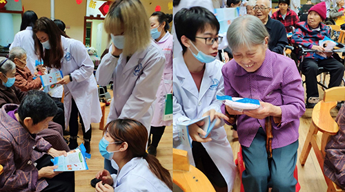 讲座结束后,同学们给每位老人发放了有关血栓预防的知识手册,结合自己课堂上所学的知识,用浅显易懂的语言一对一地给老人讲解内容并演示,发挥在早接课程中学到的交流技巧,尽力满足他们的情感诉求,缓解他们的孤独。老人们也为同学们的到来而高兴,与同学们分享他们的人生经历。正如养老院院庄院长介绍道,许多高龄老人就像“老小孩”,陪伴他们要有一颗赤子之心。