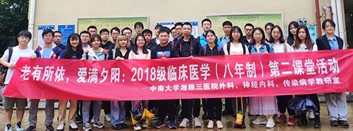 5月22日上午,迎着绵绵细雨,中南大学湘雅医学院2018级临八早期接触临床湘雅三医院组30余名同学前往红枫康乐养老中心,开展了本学期以“老有所依,爱满夕阳”为主题的第二课堂活动,对养老院的老人们与工作人员进行健康宣教。此次活动由医院教务部支持,外科教研室何金深老师、神经内科教研室吴金泽老师与传染病学教研室彭颖琼老师组织策划。