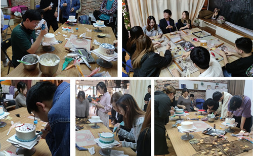 下午14时,同学们相继到达预定地点,兴致饱满,现场氛围十分活跃。首先由烘培老师指导同学们两人一组共同制作自己喜欢的蛋糕和饼干。大家充分发挥想象力和超人的艺术天赋,在愉快的协作下完成了色香味俱全的美味糕点。