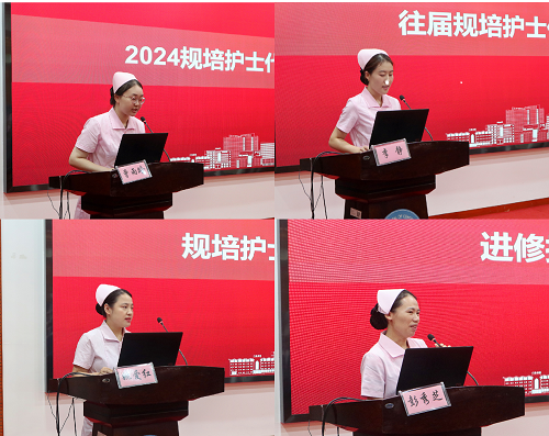 2024级规培学员曾雨晗代表25位规培学员发言,表达了全体学员对医院的感激之情和对学习的渴望之情。她代表25位学员作出承诺,将秉承南丁格尔精神,不忘初心、砥砺前行;将努力学习,不断提升自己的专业素养和综合能力;将新湘雅的“3H”(诚信Honesty、家Home、心Heart)护理文化融入到未来的工作中,早日蜕变成一位患者信赖、同事认可、社会尊重的合格护理人。2021级规培护士李静代表往届规培护士分享了自己的规培历程,鼓励学员们培养对专业的热爱与追求。神经内科8病区姚爱红代表规培护士导师发言,分享了其带教经验,鼓励新护士保持热忱、不断提高自己。望城区人民医院彭秀芝代表第3期进修护士表态,将严格遵守医院各项规章制度,积极交流合作,认真完成学业,不辜负选派单位领导和同事们期望,做到学用结合,学有所获。