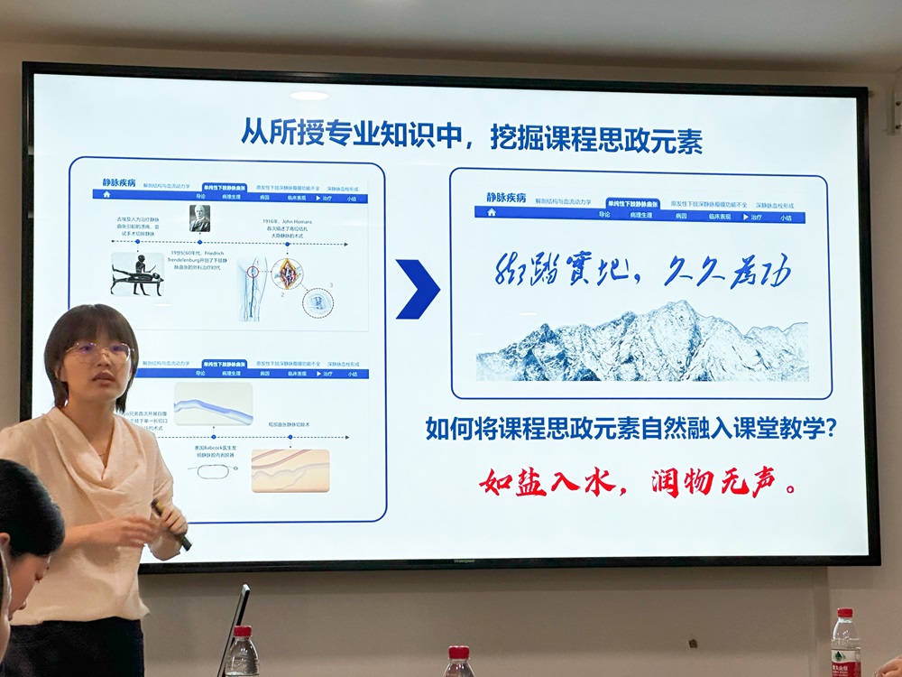 首先,王沫老师结合自身课程思政教学竞赛的经历,向大家分享了自己从校赛的摸索,最后走向省级复赛决赛舞台的不懈探索历程。她从血管外科专科知识引入思政元素,深入浅出地讲述了思政元素的重要性,详细介绍了课程思政竞赛的比赛形式、要求;她从“四个维度”的教学目标设立,到“三环节、四空间”教学模式应用,再到“一心三力”教学效果评价,对课程思政说课的设计过程每一部分内容都做了精细、生动的讲解。最后,王老师向大家展示了省赛决赛10分钟非常精彩的课程思政说课示范。