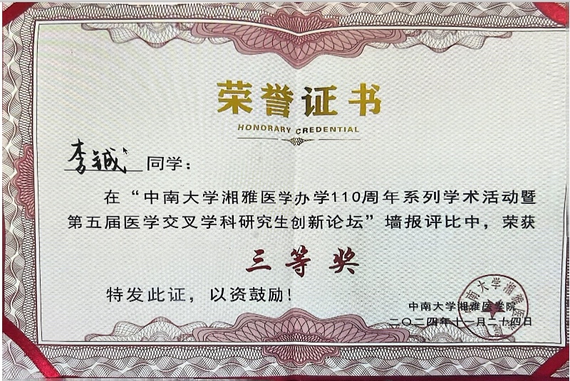 2024年11月24日,在湘雅医学办学110周年纪念系列学术活动暨第五届医学交叉学科研究生创新论坛比赛中,湘雅三医院研究生李铖博士(导师:王龙教授)在壁报展示中荣获三等奖,其研究成果的展示得到了观赛人员和评委老师们的高度评价。