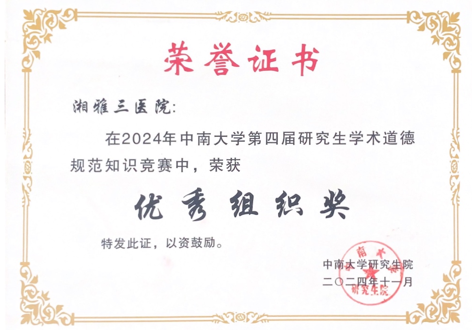 在2024年11月16日举办的中南大学第四届研究生学术道德规范知识竞赛中,中南大学湘雅三医院的34名研究生凭借扎实的学术素养和高尚的学术道德荣获佳绩,湘雅三医院集体获得优秀组织奖。这一荣誉不仅是对湘雅三医院研究生学术道德教育成果的肯定,也是对医院教育质量的高度认可。本次竞赛旨在促进立德树人和优良学风建设,教育培养研究生遵守学术道德规范,坚守学术诚信,提高学校研究生培养质量,进一步普及学术道德规范相关知识、提高研究生学术道德修养,营造优良的学风建设氛围和育人环境。