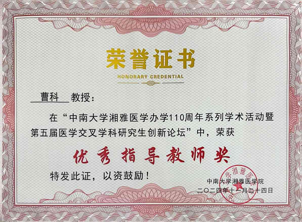 张港华博士(导师:曹科教授)在本次创新论坛比赛的口头汇报中获得三等奖,其精彩的汇报赢得了在场观众的热烈掌声。特别值得一提的是,湘雅三医院副院长曹科因其在指导学生方面的贡献,被授予优秀指导教师奖。