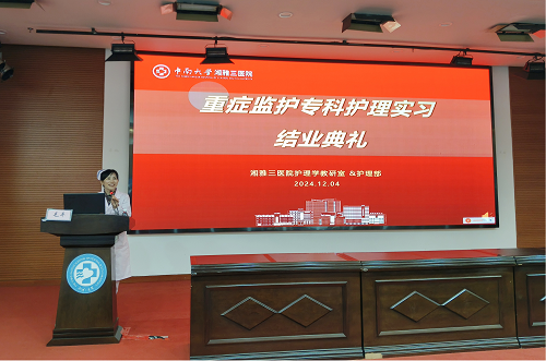 12月4日,中南大学湘雅三医院2024年度重症监护专科护理实习培训班结业典礼在医院外科楼二楼学术报告厅举行,护理学教研室主任毛平、副主任黄辉参加,副主任戴婵媛主持结业仪式。