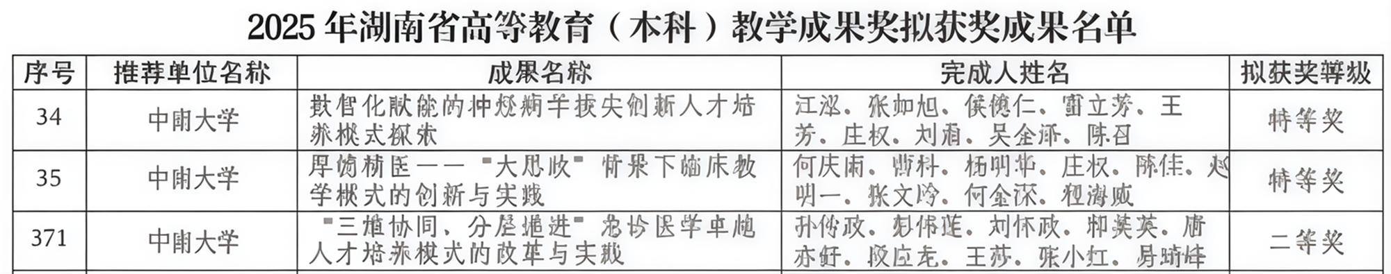 湖南省高等教育教学成果奖是全省高等教育教学领域的重要奖项,旨在奖励在教学实践、改革和研究中取得显著成果的单位和个人,发挥成果的示范引领作用。本次两个特等奖分别为:何庆南教授领衔的《厚德精医——“大思政”背景下临床教学模式的创新与实践》以及江泓教授率领的《数智化赋能的神经病学拔尖创新人才培养模式探索》。同时,孙传政教授牵头申报的《“三维协同、分层递进”急诊医学卓越人才培养模式的改革与实践》获二等奖。值得关注的是,上述三项成果此前已获评2025年中南大学高等教育(本科)教学成果奖一等奖,此次获奖实现了从校级一等奖到省级特等奖的历史性突破,充分展现了我院本科教学改革成果的持续积累与高质量输出。