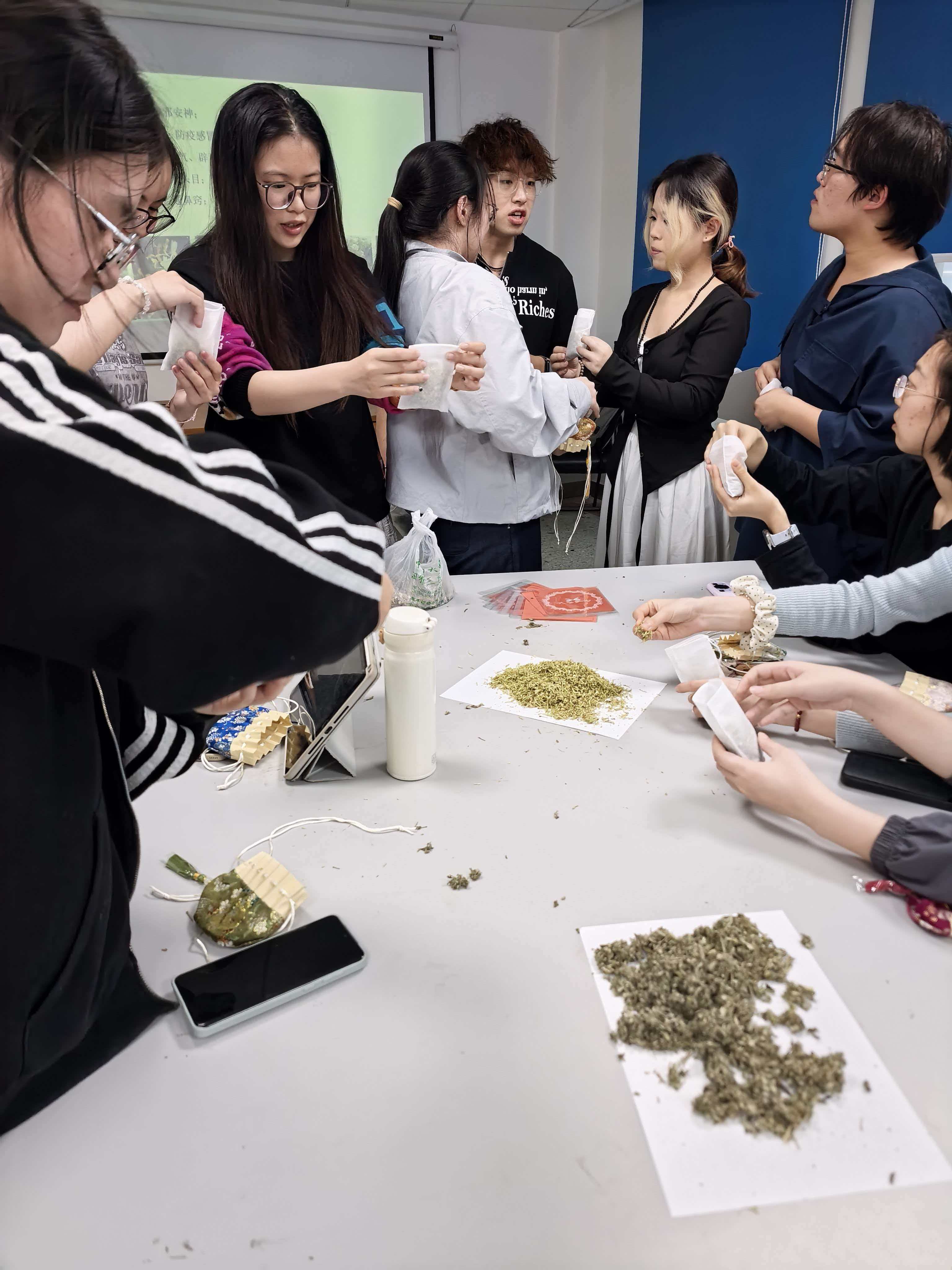 识药竞猜环节结束后,活动进入了最具实践趣味的“制作中药香囊”阶段。老师首先向同学们讲解了中药香囊的历史渊源与保健原理:“佩帷”“容臭”自古便是中医“衣冠疗法”的重要组成部分,通过佩戴含有芳香辟秽、醒脾化湿药物的香囊,可达到预防时疫、驱虫避秽、安神助眠等功效。随后,同学们在老师的指导下,自己动手调配并制作成个性化香囊。艾叶、薄荷、佩兰、白芷、丁香等多种气味芬芳的中药材,大家依据不同功效需求,遵循君臣佐使的配伍原则,称量、混合、研磨,再装入色彩斑斓的锦囊之中。同学们一边制作,一边交流各自配方的心得,教室里弥漫着沁人心脾的药草香。