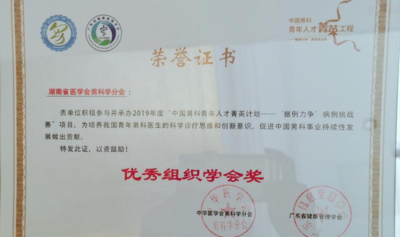 湘雅三医院泌尿外科是湖南省医学会男科学主委单位,何乐业教授担任湖南省男科学专业委员会主任委员期间,年会论文投稿数逐年提升,积极推动医院及我省男科学事业的发展,在2019年度“中国男科青年计划——‘据例力争’病例挑战赛”项目中荣获“优秀组织学会奖”,得到湖南省医学会及上级学会的高度赞赏。