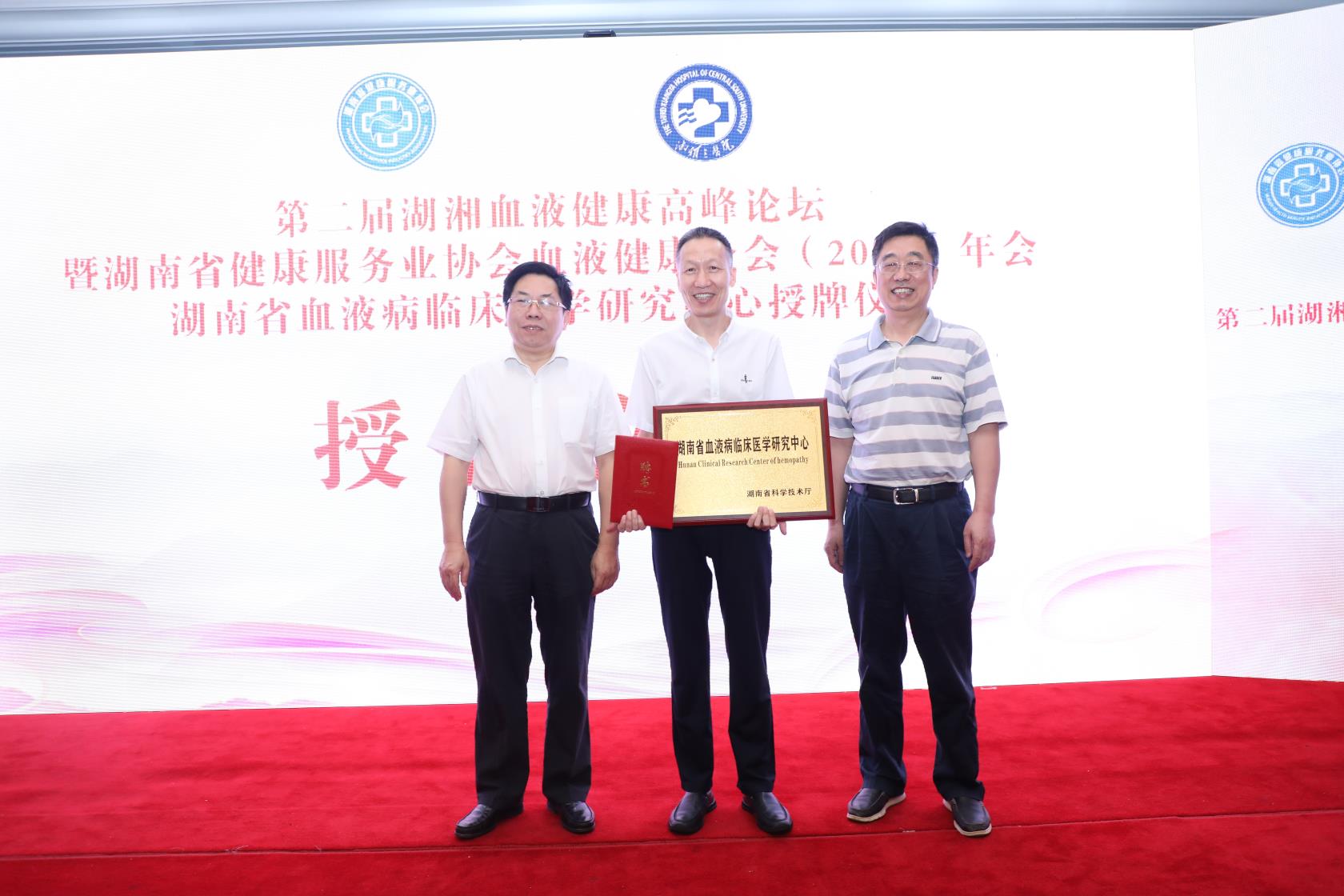 在本次会议的开幕仪式上,湖南省科技厅相关领导为中南大学湘雅三医院血液科授牌“湖南省血液病临床医学研究中心”,中南大学副校长陈立章教授,湖南省健康服务业协会理事长李桂源教授讲话,中南大学湘雅三医院院长张国刚、湖南省健康服务业协会会长陈方平教授分别就会议的举办致辞。