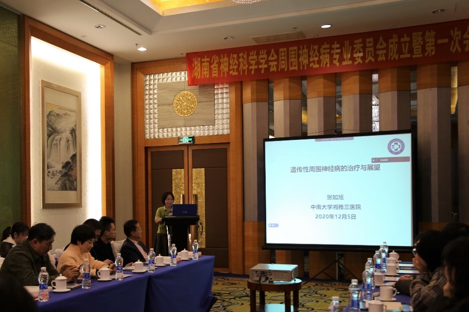 第一次会议由副主任委员南华大学附属南华医院陈勇军教授主持。张如旭教授作为会议主席致辞。她对湖南省神经科学学会一直以来都高度重视和大力支持周围神经病领域发展表示衷地感谢,并基于本届周围神经病专委会高度学科交叉、临床-基础融合的特点,提出了合作研究及临床转化等方面的工作蓝图。随后,张如旭教授以“遗传性周围神经病的治疗与展望”为题进行了学术报告,就遗传性周围神经病的研究现状做出概述,并详细介绍了家族性淀粉样多发性神经病变(ATTR-PN)的临床特点和治疗进展。ATTR-PN是一种由于转甲状腺素蛋白(TTR)基因突变,导致转TTR淀粉样物质在组织中异常沉积而致病的常染色体显性遗传病,预计中国患者约2000人。今年2月份获得中国国家药品监督管理局批准的罕见病创新药维达全已经用于ATTR-PN I期症状患者。此外,她还对常染色体隐性遗传CMT2新致病基因SORD的克隆、分子机制以及治疗靶点探索做了详细讲解,并介绍了目前国际上SORD相关CMT进行中的研究项目。