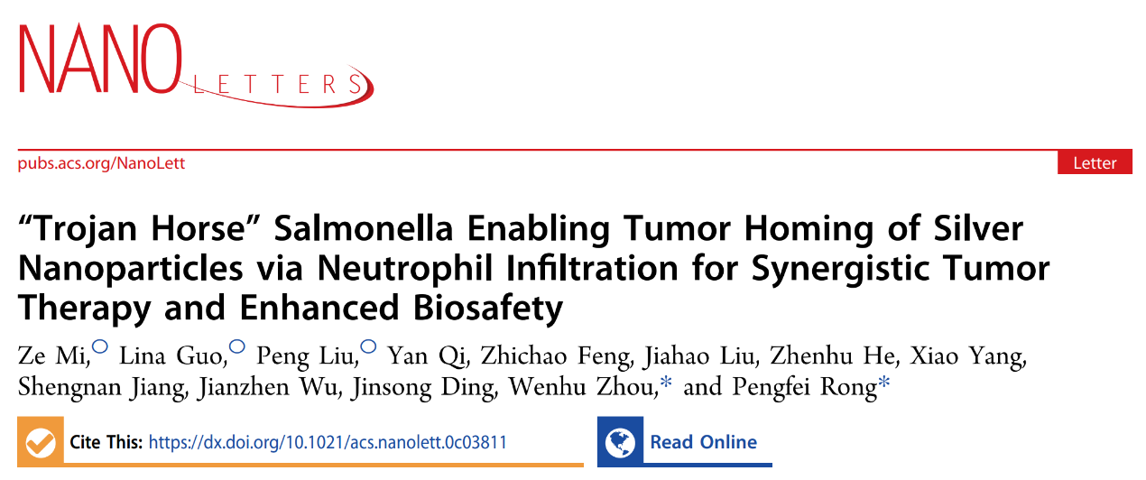 12月23日,中南大学湘雅三医院放射科容鹏飞教授团队与中南大学湘雅药学院周文虎教授团队联合在国际分子影像权威期刊《Nano Letters》(IF=11.238)上发表题为《“Trojan Horse” Salmonella Enabling Tumor Homing of Silver Nanoparticles via Neutrophil Infiltration for Synergistic Tumor Therapy and Enhanced Biosafety》的最新研究论文。