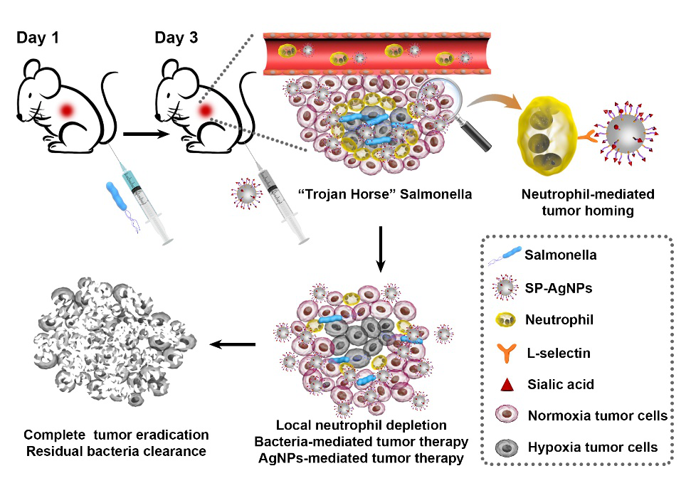 沙门氏菌选择性地定植于缺氧性肿瘤区域,并通过多种机制发挥抗肿瘤作用,而定植在肿瘤中的沙门氏菌招募宿主中性粒细胞进入肿瘤内,从而提供了关键的免疫学限制以损害沙门氏菌的免疫功效。在此,中南大学湘雅三医院放射科容鹏飞教授、中南大学湘雅药学院周文虎教授等人开发了一种抗肿瘤组合策略,通过使用银纳米颗粒(AgNPs)提高沙门氏菌的功效和生物安全性,该技术形成的联合抗肿瘤技术平台,也为开发其他的联合肿瘤治疗策略提供了新思路,是临床转化的基础性工作。