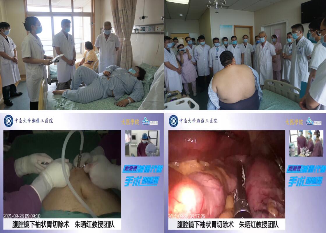 9月28日是大家都翘首以盼减重手术直播日。早上7:30,朱晒红教授、朱利勇副教授及易波副教授等带领相关培训学员来到患者病床前进行教学查房,亲切地与今日手术患者进行交流。本次手术的两名患者体重共达0.7吨,皆为重度肥胖合并糖尿病、高血压、脂肪肝、重度睡眠呼吸暂停通综合征等多种肥胖相关并发症,手术风险高,难度大,患者特求助于朱晒红教授团队。患者已完善周密的术前评估和围术期准备,查房后手术直播随之开始。本次手术由朱晒红教授和朱利勇副教授分别为两名患者主刀,进行腹腔镜下袖状胃切除术。手术过程中,两位专家庖丁解牛式地向与会者讲解操作要点和注意事项,观看直播的学员们目不转睛,认真观摩,不断地思考,互相之间进行了热烈讨论。两台手术耗时合计约2小时30分钟,术中出血量合计不到10ml,整场直播吸引了全国近2万余人次在线观看并参与讨论,时间虽长,但学员们都不曾感到疲惫,依旧热情饱满,期待接下来的学习。