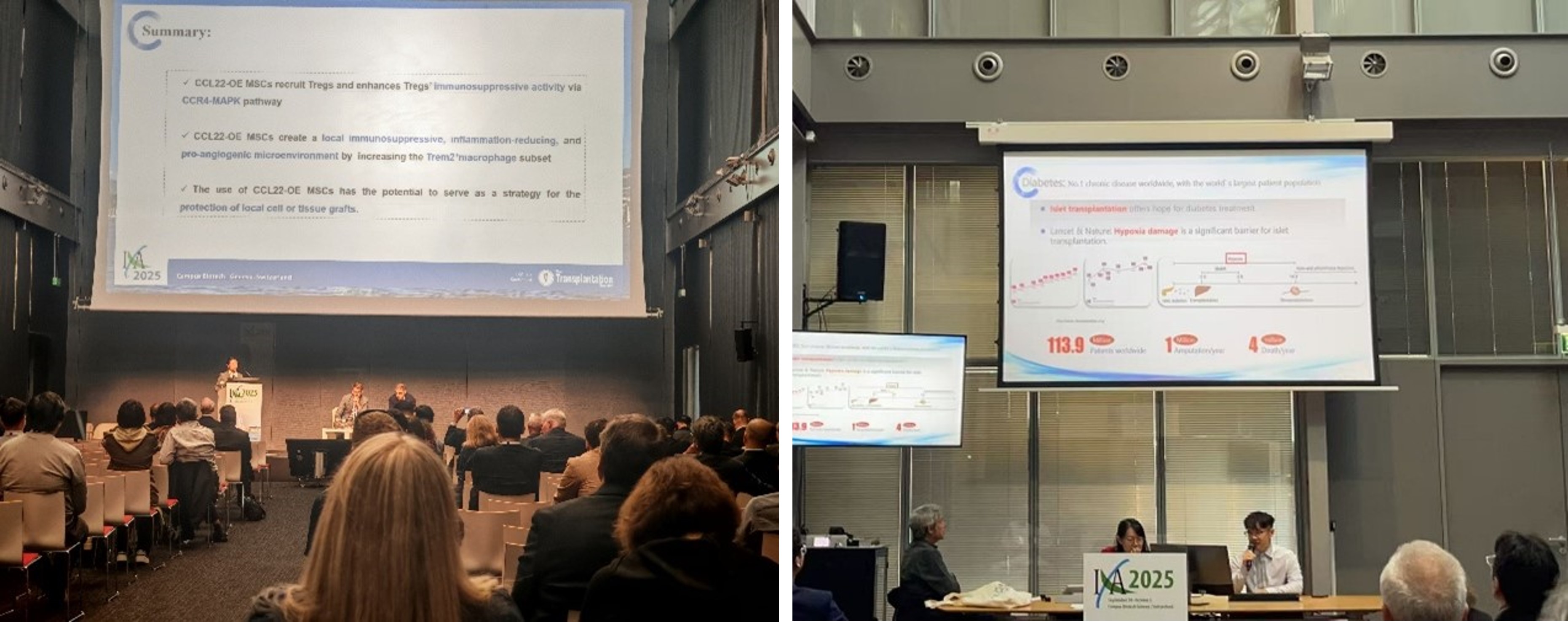 团队的青年学者同样表现出色,2022级博士生李娅楠在“免疫抑制与耐受”主题会议上报告《Engineered MSCs releasing CCL22 remodel the local immune microenvironment to promote graft tolerance》,展示了团队在免疫调控与移植物耐受方面的创新探索。2023级博士生吴健民在“胰岛异种移植”专题会议上报告《Targeting the redox balance of beta cells by SH/S-S conversion for islet transplantation》,介绍了团队在调控胰岛氧化还原平衡及提高移植存活率方面的最新研究进展。此外,吴健民博士与陈娟博士的两篇论文被大会接收并以壁报形式展示,使中南大学成为本届大会中展示研究成果数量最多的中国团队。