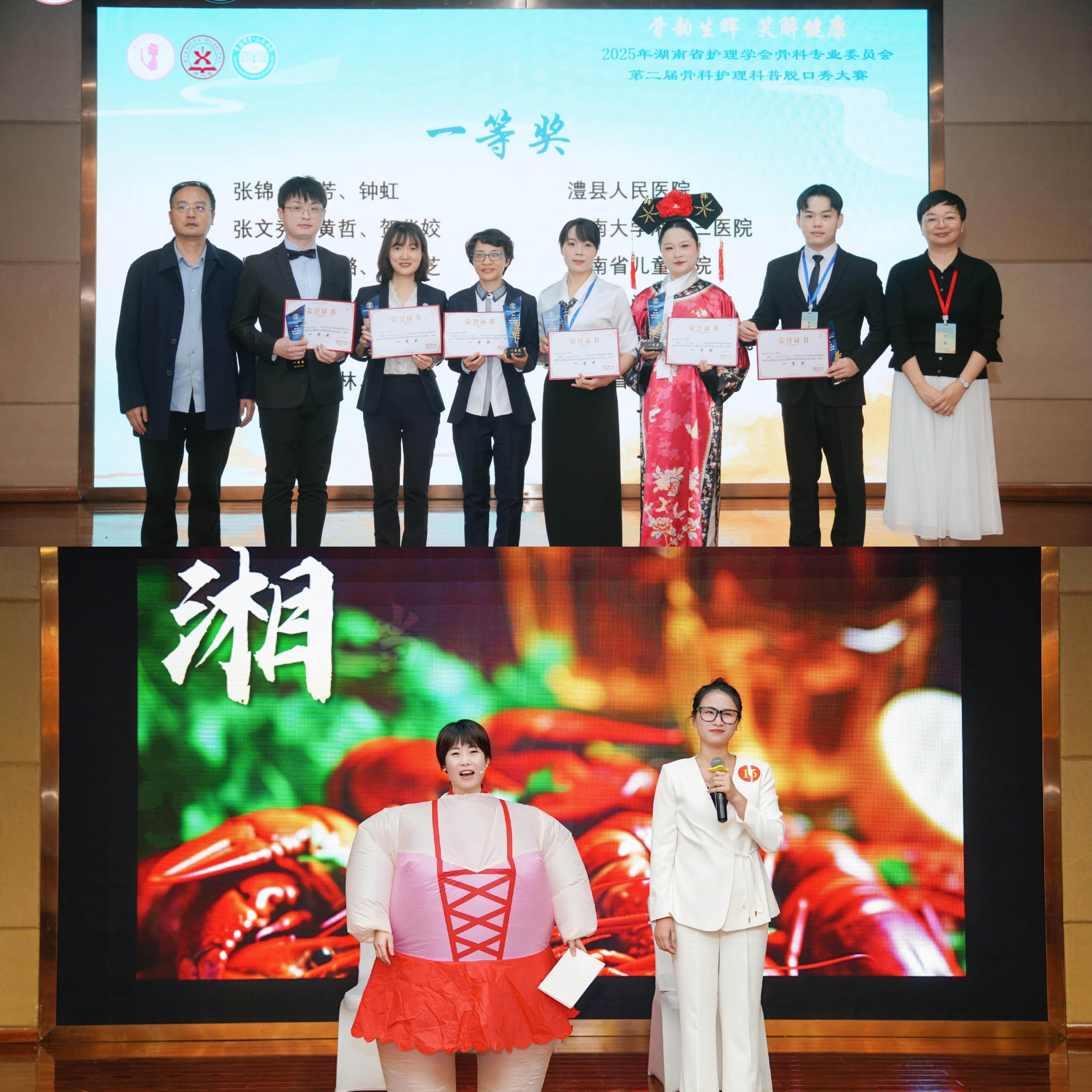 10月30日,在骨科护士长张文秀的带领下,主管护师黄哲与贺华姣凭借原创作品《湘约健康膝》惊艳全场,荣获湖南省骨科护理科普脱口秀大赛一等奖。作品以幽默温暖的语言,将骨科护理知识融入日常生活场景,在轻松互动中传递健康理念。作品的创意来源于临床工作中的真实片段,既有温情的叙述,也有专业的思考,让观众在欢笑中了解健康、感受护理。现场掌声经久不息,评委与观众一致称赞。