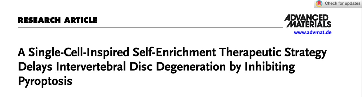 2025年11月5日,中南大学湘雅三医院脊柱外科邓幼文教授在生物材料国际顶级学术期刊《先进材料》(Advanced Materials,中国科学院/JCR一区,Top期刊,影响因子:26.8)发表题为 “一种基于单细胞启发的自富集治疗策略通过抑制细胞焦亡来延缓椎间盘退变(A Single-Cell-Inspired Self-Enrichment Therapeutic Strategy Delays Intervertebral Disc Degeneration by Inhibiting Pyroptosis)”的原创研究论文。中南大学湘雅三医院为该论文第一及通讯作者单位,脊柱外科2024级博士研究生周豪与硕士研究生宁昊为论文共同第一作者,邓幼文教授、刘仁峰医师为论文共同通讯作者。