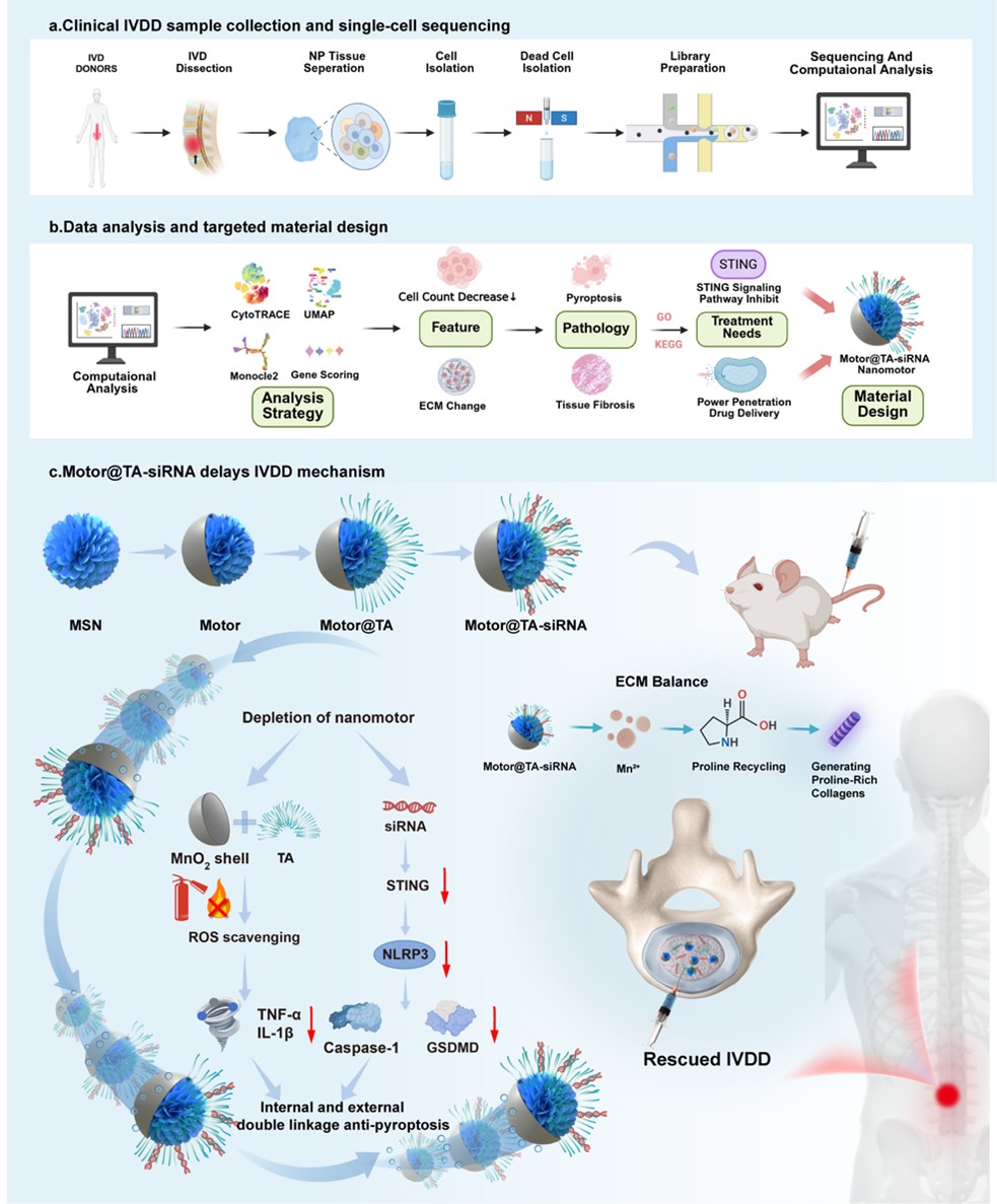 椎间盘退变(IVDD)是进行脊柱外科手术的主要原因。目前的治疗方法无法阻止或逆转其发展进程,这主要是由于对关键机制的理解有限以及缺乏针对性的治疗手段。本研究旨在将单细胞转录组学与临床验证相结合,构建一个关于椎间盘退变的全细胞图谱。该研究揭示了退变组织中明显的纤维化屏障,严重阻碍了药物的输送,并发现由干扰素刺激因子(STING)介导的多种炎症通路激活所驱动的髓核细胞发生焦亡现象。为了克服这些挑战,本研究开发了一种自富集纳米载体(Motor@TA-siRNA),它能催化过氧化氢产生不对称气泡推进,从而能够选择性地渗透到退变组织中,而不积聚在健康组织中。单宁酸与 siRNA形成氢键网络,从而增强其稳定性,提高传递效率。siRNA精确靶向 STING通路,从源头上阻断炎症—焦亡信号传导。体外和体内实验结果均表明,这种纳米载体具有出色的生物相容性,并显著延缓了椎间盘退变的进程。本研究提出了一种协同机制:靶点—材料策略,该策略将病理学见解与先进的纳米载体设计相结合,为个性化椎间盘退变治疗提供了一个有前景的平台。