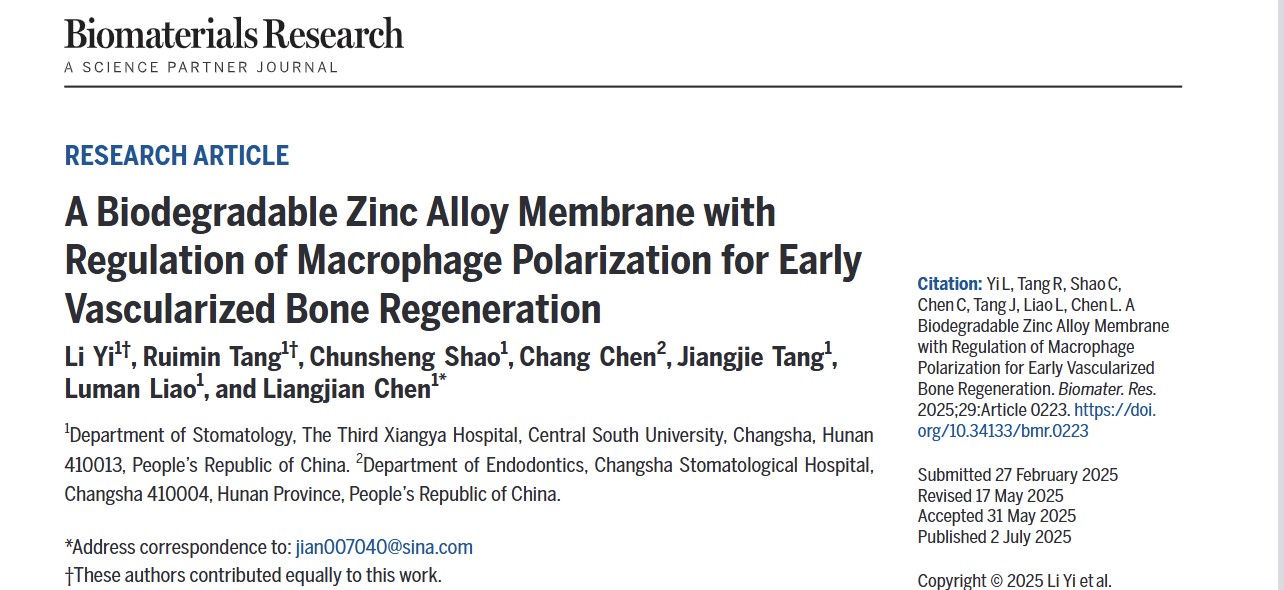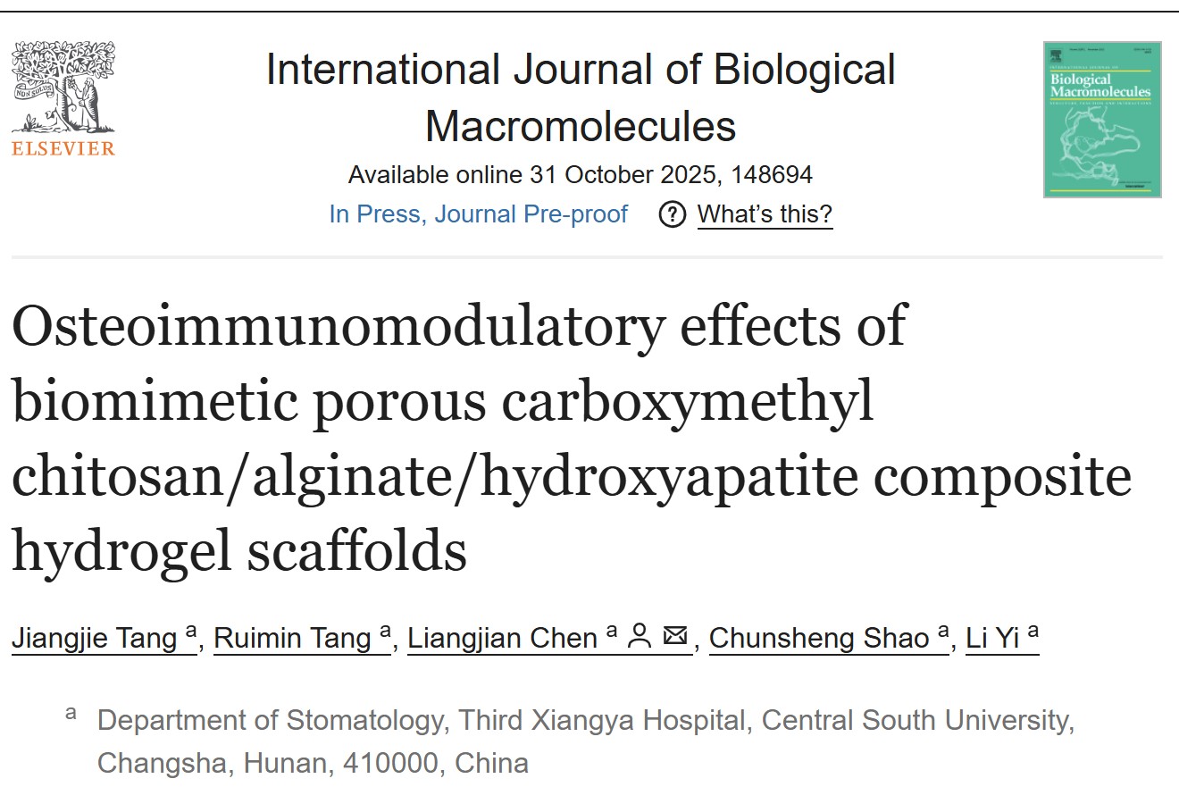 近日,中南大学湘雅三医院口腔科陈良建教授团队在骨组织工程领域取得重要研究进展,相关原创成果分别发表于《生物材料研究(BIOMATERIALS RESEARCH,影响因子9.6)》与《国际生物大分子杂志(International Journal of Biological Macromolecules,影响因子8.5)》。