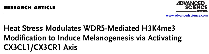 近期,陈静/曾庆海课题组在“热黑现象”前期研究上取得新的突破,在《先进科学(Advanced Science,IF=14.1)》杂志发表了题为“热应激通过激活CX3CL1/CX3CR1轴调控WDR5介导的H3K4me3修饰诱导黑素生成(Heat Stress Modulates WDR5-Mediated H3K4me3 Modification to Induce Melanogenesis via Activating CX3CL1/CX3CR1 Axis)”的文章。皮肤科张玉姗博士为该文第一作者。该研究揭示了热应激具有通过调控组蛋白甲基化修饰进而激活黑素细胞功能的作用,并发现热应激可通过MYC-WDR5-H3K4me3轴上调CX3CL1表达,从而激活CX3CL1/CX3CR1信号通路,最终促进黑素生成的分子机制。