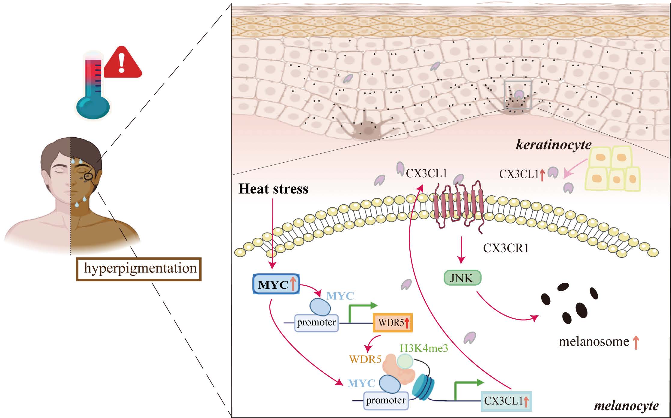 该研究通过分析黄褐斑皮肤的转录组数据,发现CX3CL1与黑素生成呈显著正相关。与之一致,CX3CL1在皮肤组织和黑素细胞中均能显著诱导黑素生成。在机制上,CX3CL1通过CX3CR1依赖性方式激活JNK信号通路,进而促进黑素生成。研究者发现热应激会触发WDR5(H3K4me3甲基转移酶的核心亚基)向CX3CL1启动子区的募集,并促进H3K4me3修饰水平,从而驱动CX3CL1的转录。抑制WDR5表达可逆转热应激对CX3CL1启动子区H3K4me3水平的上调作用,进而抑制CX3CL1表达并最终减少黑素生成。进一步研究表明,热应激诱导WDR5向CX3CL1启动子区的富集行为依赖于MYC。上述研究证实:热应激可通过MYC-WDR5-H3K4me3轴上调CX3CL1表达,进而激活CX3CL1/CX3CR1信号通路,最终促进黑素生成。该研究从表观遗传角度阐明了热应激调控皮肤色素沉着的分子机制,并揭示CX3CL1、CX3CR1等分子是调控皮肤色素沉着的潜在治疗靶点。