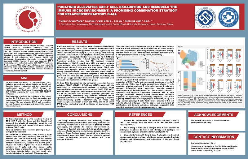 面对复发难治性B细胞急性淋巴细胞白血病中CAR-T细胞易耗竭的难题,博士研究生周屹探索了新型联合治疗策略。团队开展的临床研究显示,3例伴BCR-ABL T315I突变的难治患者在CAR-T治疗后接受普纳替尼维持治疗,均维持无进展生存,且体内可长期监测到CAR-T细胞持续扩增。周屹博士生进一步通过系列实验证实,第三代酪氨酸激酶抑制剂普纳替尼可有效改善CAR-T细胞耗竭并重塑免疫抑制微环境,与CAR-T治疗具有协同增效潜力,为克服耐药、改善患者预后提供了新策略。