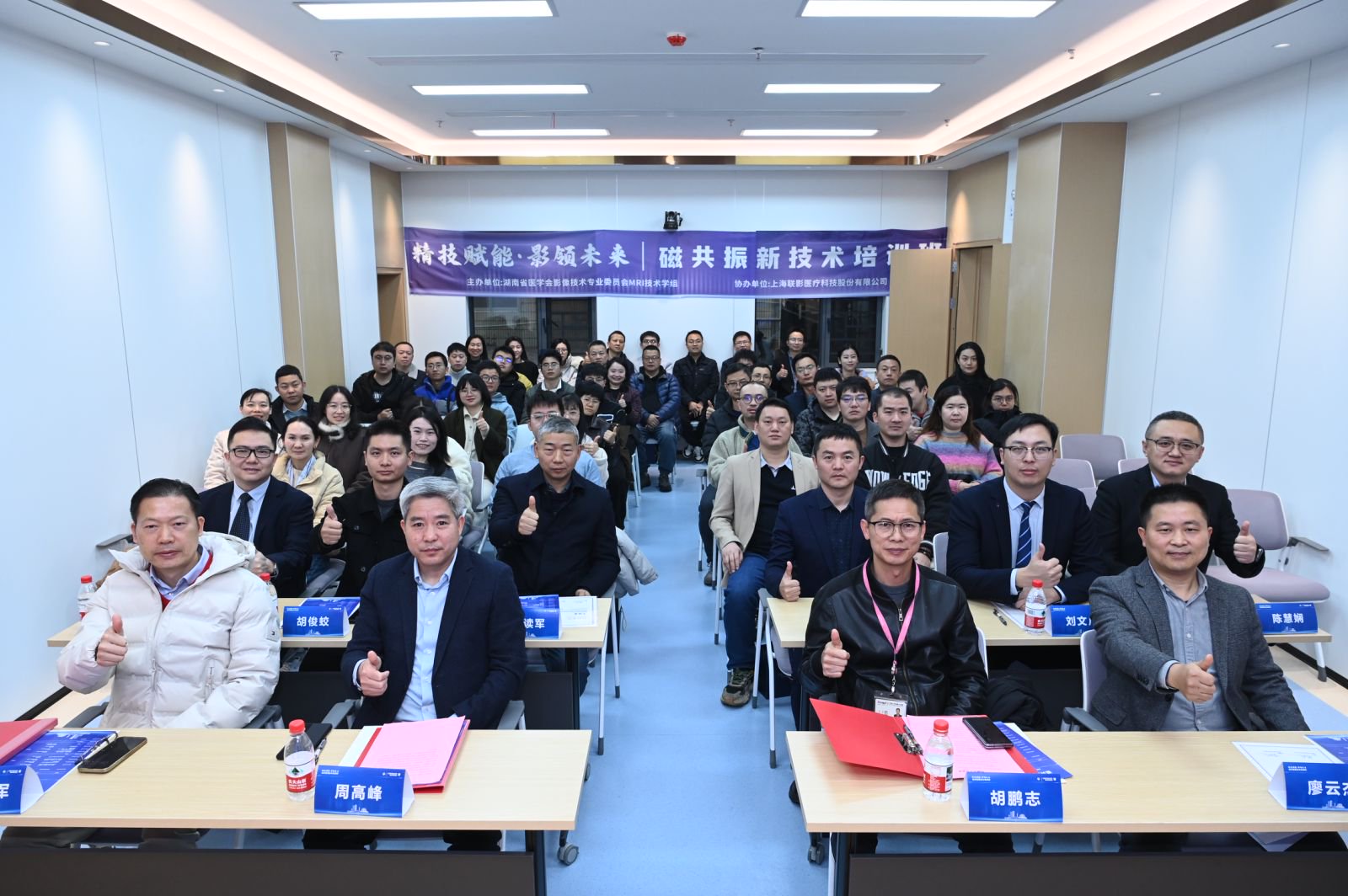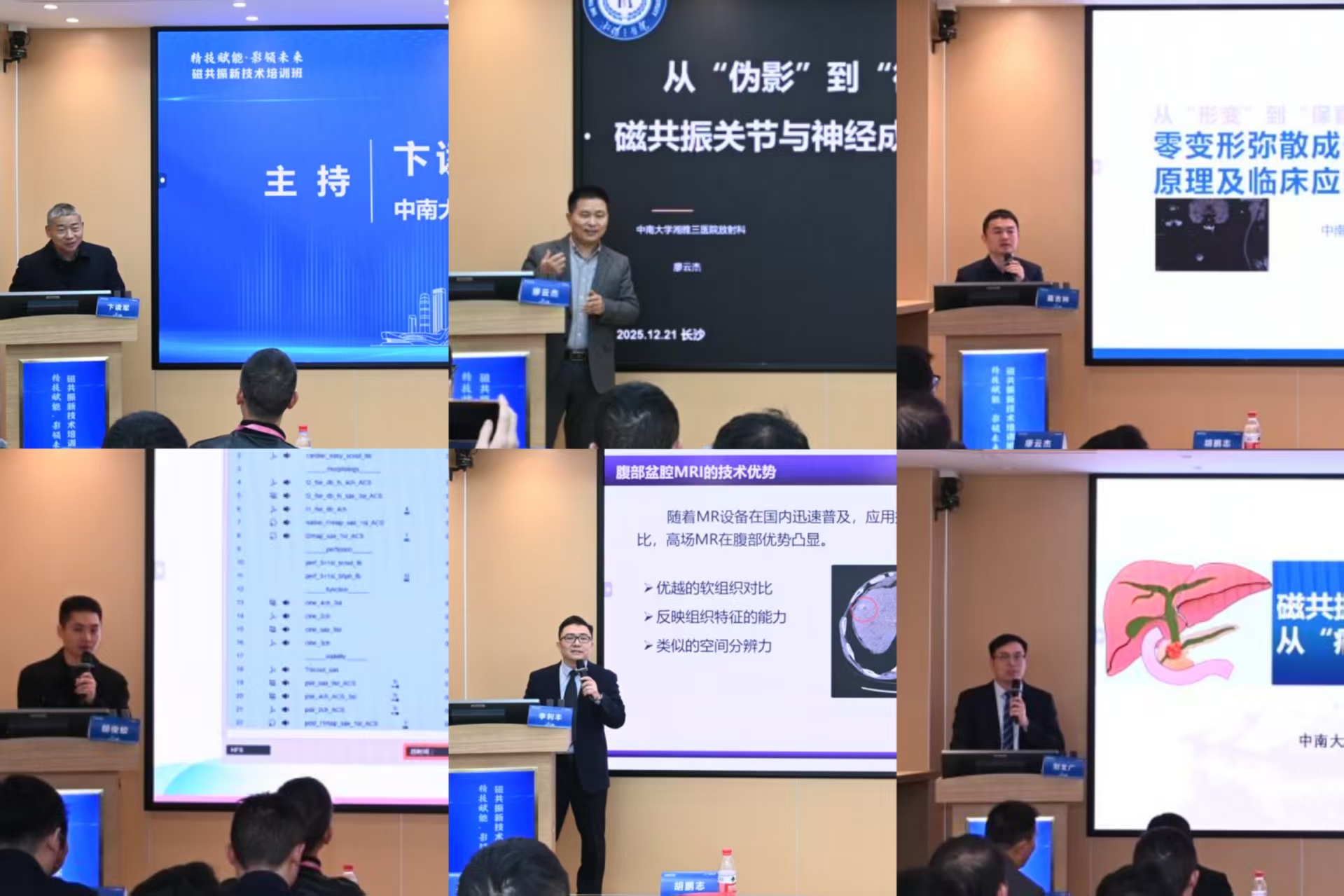 本次培训班以“精技赋能,影领未来”为主题,分为理论授课和实践教学两部分展开。上午的理论授课部分由中南大学湘雅二医院卞读军和中南大学湘雅医院聂吉林担任主持。湖南省医学会影像技术专业委员会众多金牌讲师纷纷授课:中南大学湘雅三医院廖云杰主讲《“伪影”到“微观”,磁共振关节与神经成像进阶之路》,中南大学湘雅医院聂吉林主讲《ARMS-DWI的原理及全身应用》,中南大学湘雅二医院胡俊蛟主讲《精准“心”视野:心脏MRI技术从扫描痛点到解决方案》,中南大学湘雅三医院李利丰主讲《超越呼吸,洞见真“相”:腹部盆腔MR新技术解析》,中南大学湘雅医院刘文广主讲《磁共振上腹部扫描:从“痛点”到“亮点”的案例实战》。另外培训班特别邀请了上海联影磁共振厂家工程师李卫星和陈慧娴两位老师分别讲授了《MR常见伪影及解决方案》和《磁共振新技术进展》两堂精彩课程。这些课程既聚焦前沿、又深耕应用,围绕神经、血管、心脏、腹部、骨肌等部位的磁共振扫描技术及新进展,展开了系统讲解与讨论交流,助力广大影像技术同仁在临床实践与科研创新中拓展思路,提升能力。