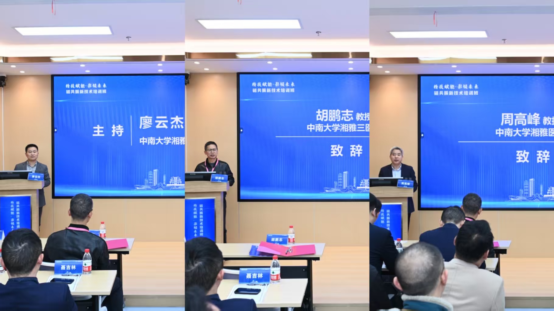 廖云杰致辞,首先对本次培训班倾囊相授的各位专家和砥砺深耕的全省同仁表达感谢和欢迎。他表示,湖南省磁共振培训班在学会领导的指导下,已举办多届,形成了湖南影像技术届的品牌效应,也真正为全省广大影像技术同道带来了前沿技术,解决了很多实际问题。接着,湖南省医学会影像技术专业委员会前任主委、中南大学湘雅三医院胡鹏志代表承办方致欢迎辞。他强调,湘雅三医院的磁共振技术已形成了血管壁斑块高清成像、癫痫成像等众多亮点,希望全省影像技术同道在学会搭建的这个重要技术平台上多多交流,共同进步。最后,湖南省医学会影像技术专业委员会现任主委、中南大学湘雅医院周高峰致辞。他表示磁共振学组在湘雅三医院的带领下强劲发展,期待每一届的磁共振培训班都能成为全省磁共振技术引领与服务基层的标杆。