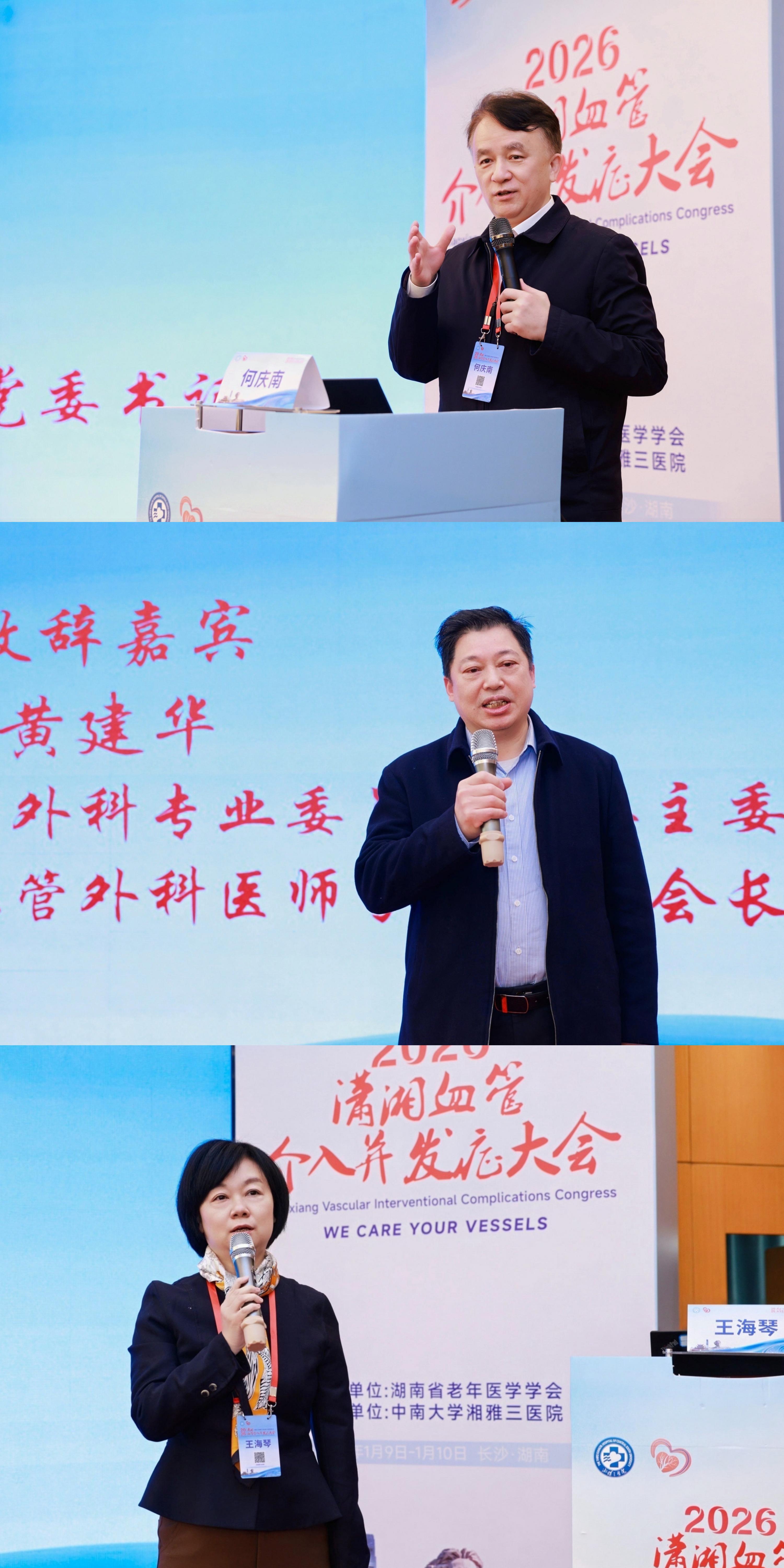 开幕式上,中南大学湘雅三医院党委书记何庆南致辞。他指出,医院正处于船到中流的关键时期,唯有高质量发展方能行稳致远。本次大会聚焦血管介入并发症这一临床难点,充分体现了血管外科追求医疗质量安全的责任担当,是推进学科高质量发展的重要举措。他回顾了医院对血管外科从创立到独立成科的一贯支持,同时对血管外科的下一步发展表达了殷切期望。随后,湖南省医学会血管外科专业委员会名誉主委黄建华、湖南省老年医学会党支部书记王海琴也分别致辞,对大会的召开表示祝贺。