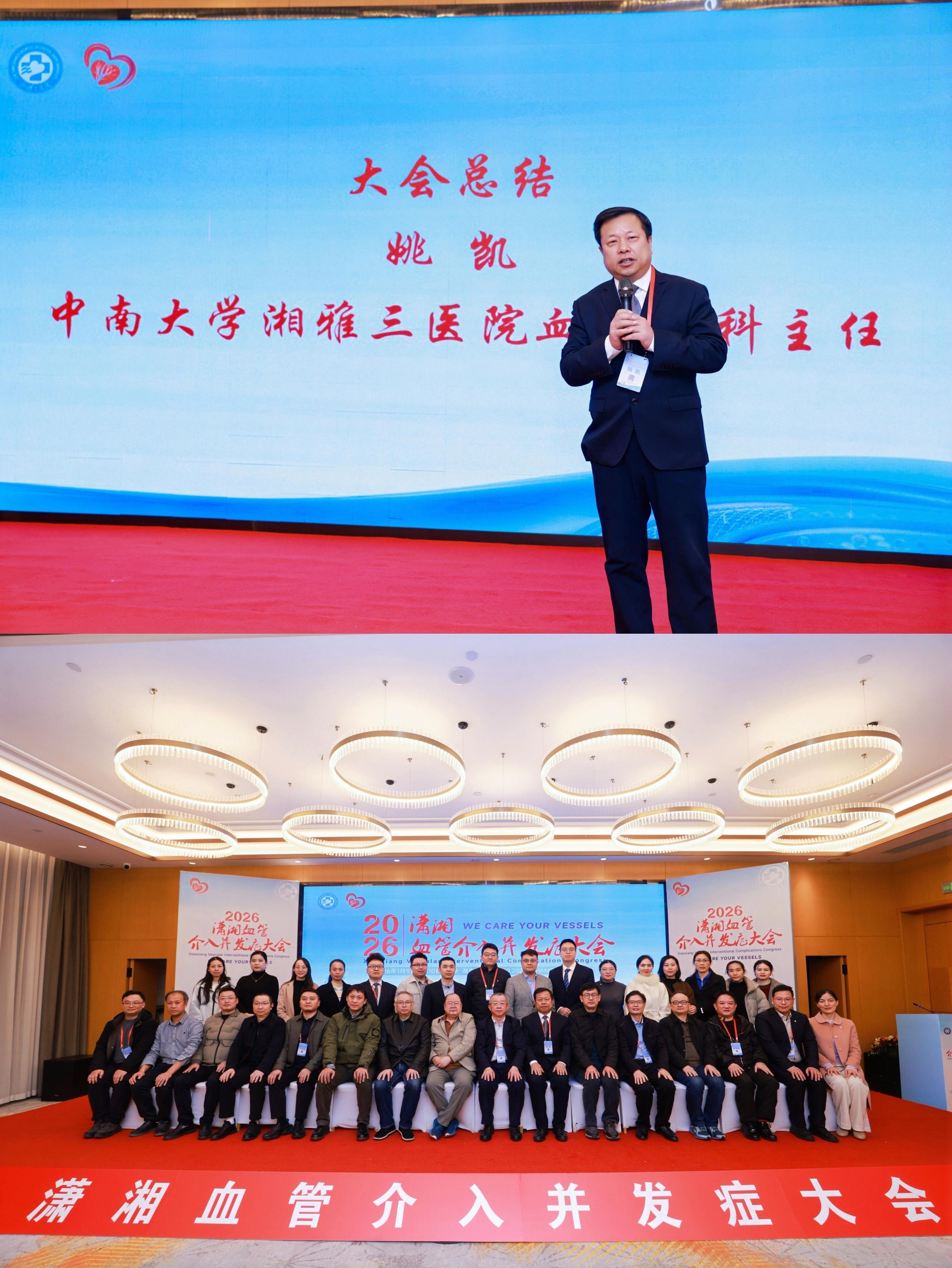 1月9日至10日,由湖南省老年医学会临床精准医疗分会主办、中南大学湘雅三医院血管外科承办的“2026年潇湘血管介入并发症大会”在长沙举办。会议汇聚国内多家知名医院的血管外科专家,围绕血管介入并发症展开深入探讨。会议开幕式由大会主席、中南大学湘雅三医院血管外科主任姚凯主持。
