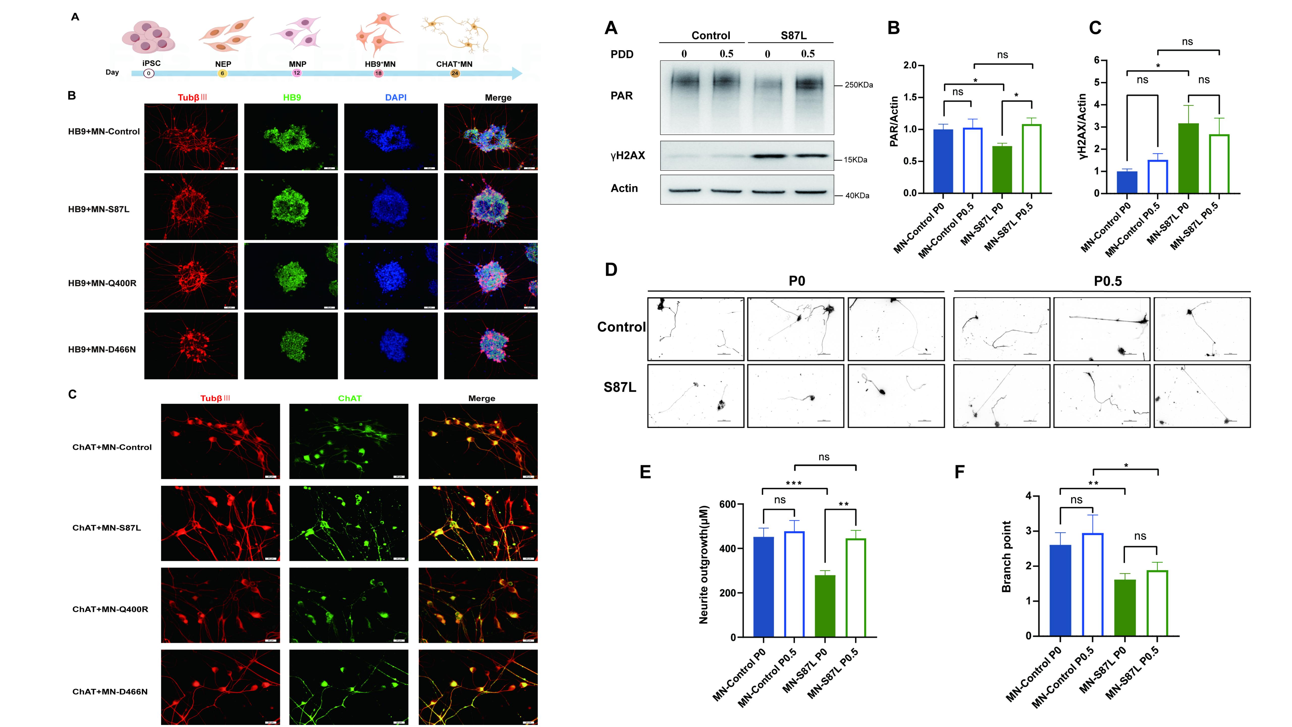 MORC2突变与一系列神经运动障碍相关,包括腓骨肌萎缩症2Z型(CMT2Z)和脊髓性肌萎缩(SMA)样表型。然而,这些疾病的发病机制尚不明确。团队利用携带三种不同MORC2突变(p.S87L,p.Q400R,p.D466N)的iPSC来源的运动神经元(iPSC-MNs)模型,发现MORC2突变会诱发细胞凋亡、DNA损伤和轴突病变,包括神经突缩短、轴突断裂增加和轴突肿胀增多。进一步研究发现这些突变通过破坏MORC2与PARP1之间的相互作用,导致PARP1活性和表达降低,同时DNA修复蛋白的表达和募集减少,进而引起DNA损伤修复严重受损。研究证实,使用PAR水解酶抑制剂PDD提升PAR水平,可有效减轻DNA损伤,挽救轴突生长缺陷,这为未来开发靶向治疗提供了明确的新方向。