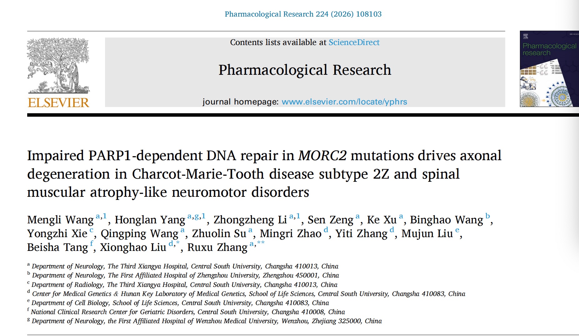 近日,中南大学湘雅三医院神经内科张如旭教授团队与中南大学湘雅医学院生命科学学院刘雄昊教授团队在国际权威期刊《Pharmacological Research》(IF=10.5,中科院一区Top)发表原创性研究论著《PARP1依赖性DNA修复受损在MORC2突变所致CMT2Z和脊髓性肌萎缩样神经运动障碍中驱动轴突变性(Impaired PARP1-dependent DNA repair in MORC2 mutations drives axonaldegeneration in Charcot-Marie-Tooth disease subtype 2Z and spinal muscular atrophy-like neuromotor disorders)》。首次从iPSC来源的运动神经元(iPSC-MNs)水平发现MORC2基因突变通过破坏MORC2与PARP1的相互作用影响DNA损伤修复从而导致运动神经元凋亡和轴突损伤的全新机制。