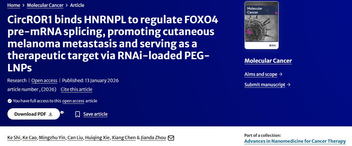 近日,中南大学湘雅三医院烧伤整形科周建大团队在国际肿瘤领域权威期刊《Molecular Cancer》(分子癌症,中科院一区,IF=33.9)发表原创性论著“CircROR1 binds HNRNPL to regulate FOXO4 pre-mRNA splicing, promoting cutaneous melanoma metastasis and serving as a therapeutic target via RNAi-loaded PEG-LNPs”(环状RNA ROR1通过与HNRNPL结合调控FOXO4前体mRNA剪接,进而促进皮肤黑色素瘤转移,并可通过负载RNAi的PEG-LNPs作为治疗靶点)。该研究在国际上首次揭示了CircROR1通过结合剪接因子HNRNPL重塑FOXO4前体mRNA可变剪接,从而驱动皮肤黑色素瘤(cutaneous melanoma, CM)转移进展的关键分子机制,并进一步验证靶向circROR1的RNA干扰(RNAi)纳米药物的策略,为转移性黑色素瘤的精准治疗提供了新的潜在靶点和转化路径。中南大学湘雅三医院周建大教授为论文的通讯作者,中南大学湘雅三医院史可博士研究生为文章的第一作者。